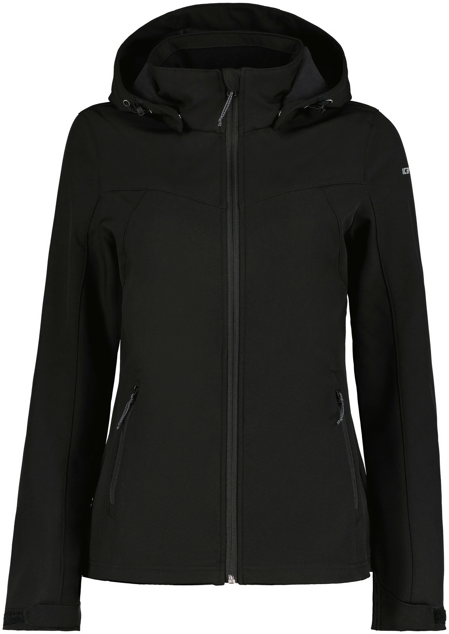 Veste softshell avec capuche amovible, taille et poignets réglables.