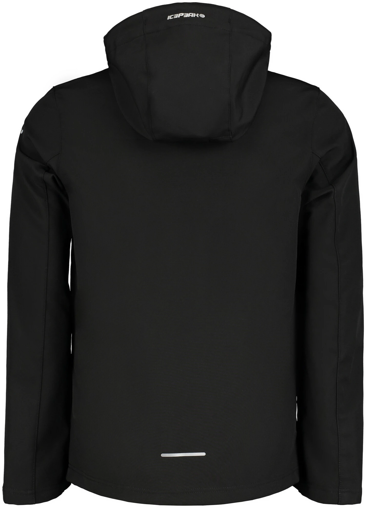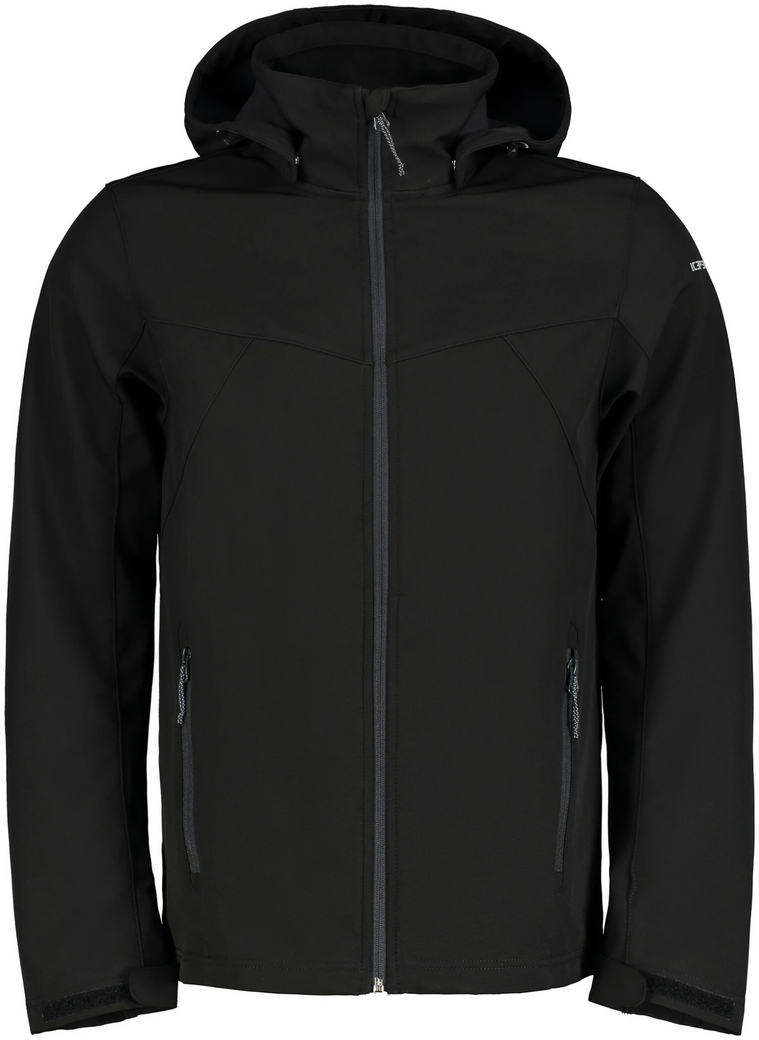 Veste softshell avec capuche amovible, taille et poignets réglables.